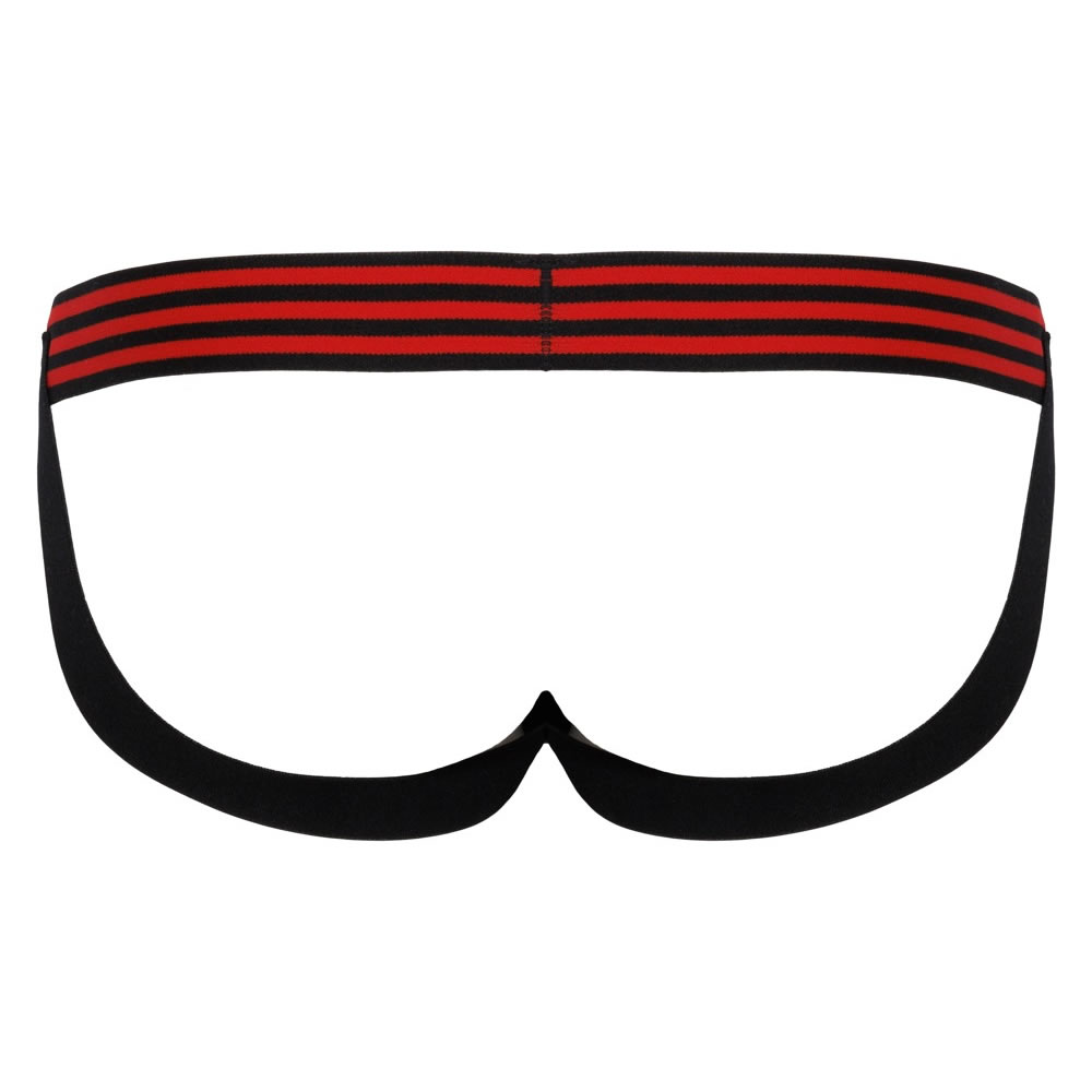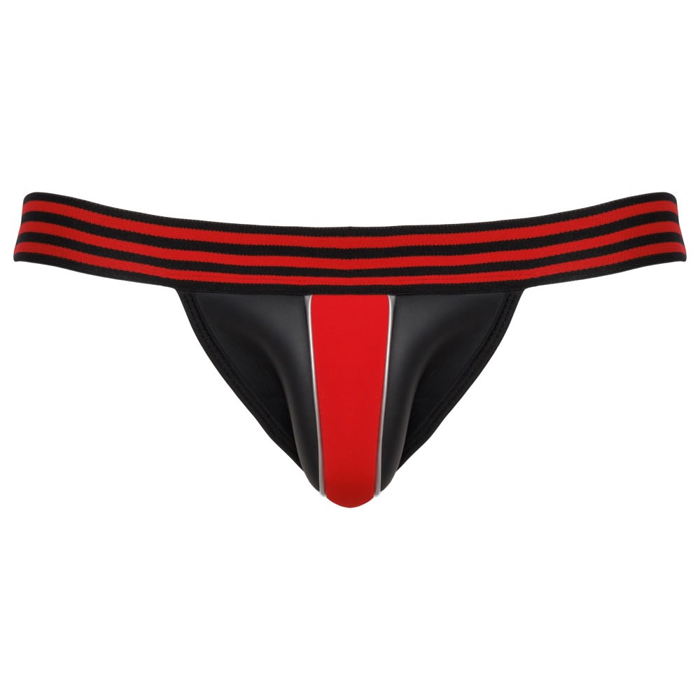 Jockstrap moške hlačke v videzu neoprena, v kombinaciji črne in rdeče barve. S širokim, elastičnim, črtastim pasom.