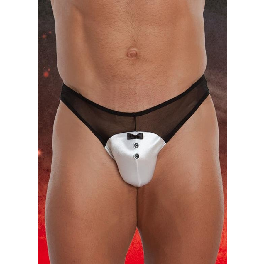 Seksi moške tanga hlačke v kombinaciji bele in črne barve, da te naredijo za seksi natakarja! Izdelane so iz močne prosojne mrežice in belega satena.