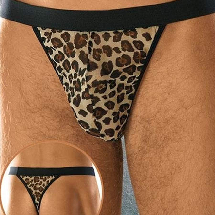 Seksi moške tanga hlačke v vročem vzorcu leoparda. Hlačke imajo širok elastičen pas. Izdelane v eni velikosti ustrezajo konfekcijski številki S – L.