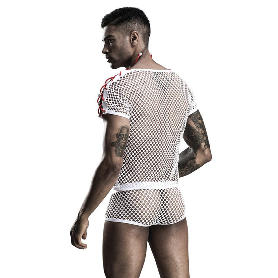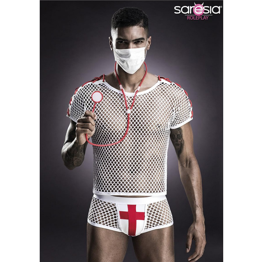 Večdelni, seksi kostum za zdravnika je sestavljen iz elastične mrežaste majice, bokserk v enakem slogu, obrazne maske in stetoskopa.