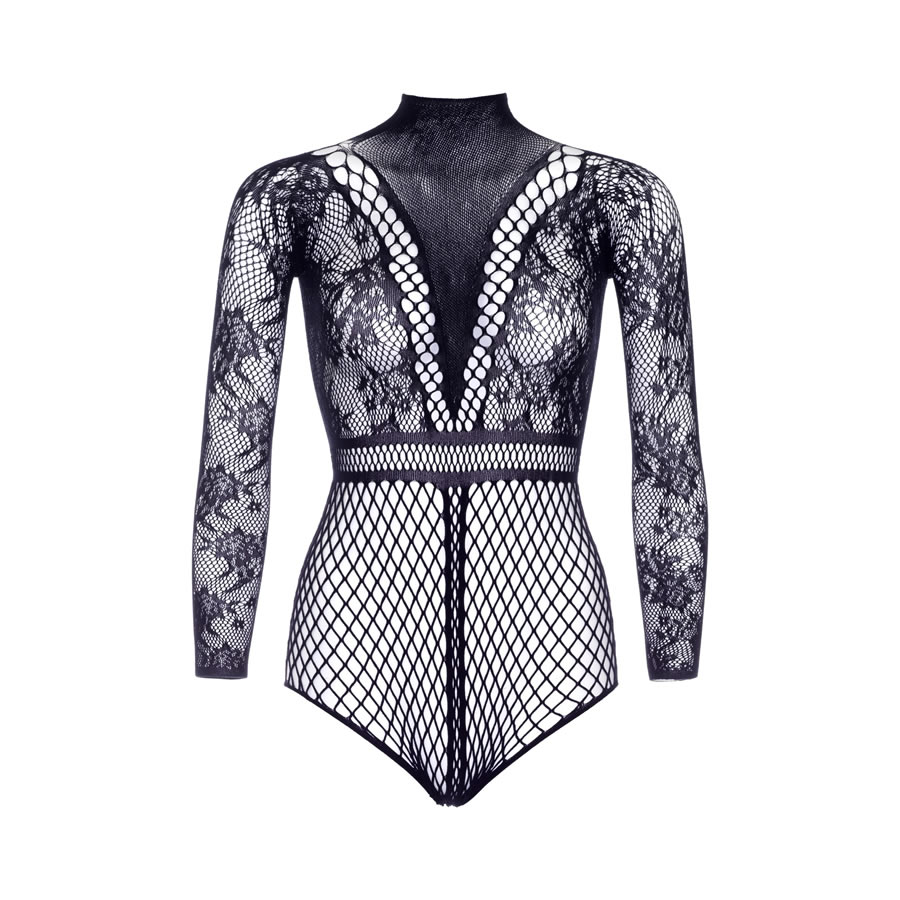 Seksi, elastičen bodi iz kombinacije mrežice in cvetličnega vzorca. Z dolgimi rokavi. Bodi je v eni velikosti in ustreza konfekcijski št. S – L.