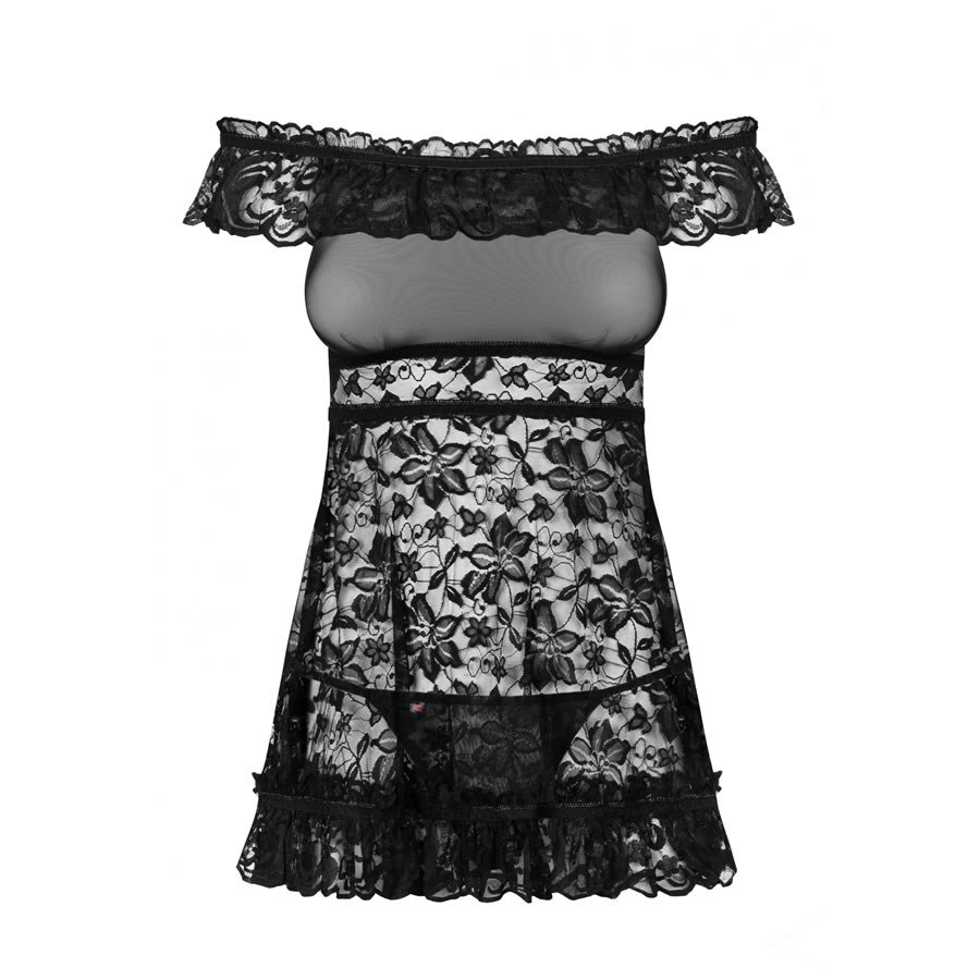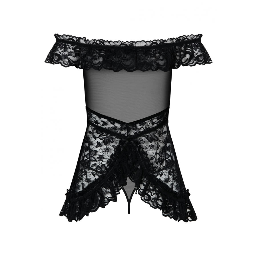 Romantičen negliže iz mehke prosojne čipke koketno poudari in izpostavi prsi. Namesto naramnic je elastičen čipkast pas z naborki, ki se nosi na nadlakteh. Spodnji del negližeja je okrašen z naborki. Hrbtna stran je seksi, s koketnim izrezom, ki poudari tvoje hlebčke. V kompletu so ujemajoče tanga hlačke.