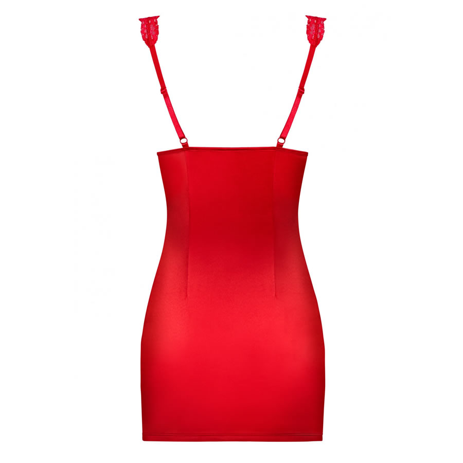 Ta negliže v vroči rdeči barvi je izdelan iz gladkega, sijočega, elastičnega satena in čipke. Čipka obroblja košarici, krasi naramnici in tudi del prsnega koša pod prsmi. Med košaricama je dekorativna pentlja. Dolžina naramnic je prilagodljiva. Priložene so ujemajoče tanga hlačke.