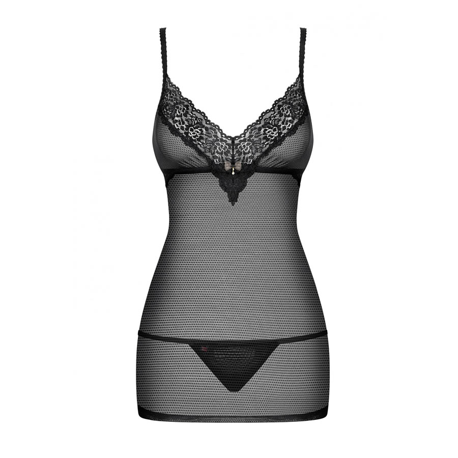 Eleganten negliže iz prosojne elastične mrežice ima dekolte obrobljen s čipko, med košaricama je satenasta pentlja z elegantnim obeskom. Dolžina naramnic je prilagodljiva. Na hrbtni strani se negliže zapenja s kaveljčki. Hrbtno stran krasi širok pas čipke. V kompletu so ujemajoče tanga hlačke.