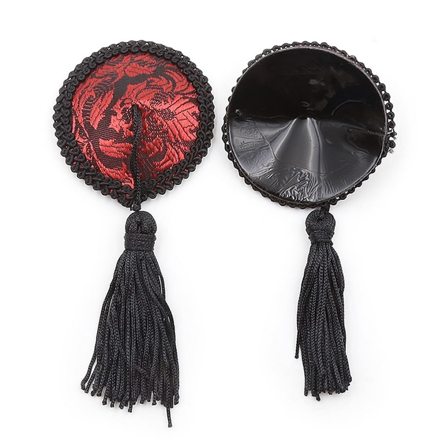 Pokrivali za bradavičke sta izdelani iz elegantnega brokata. Na sredini je cof iz mehkih resic. Pokrivali sta samolepilni, prilepita se na kožo. Sta za večkratno uporabo.