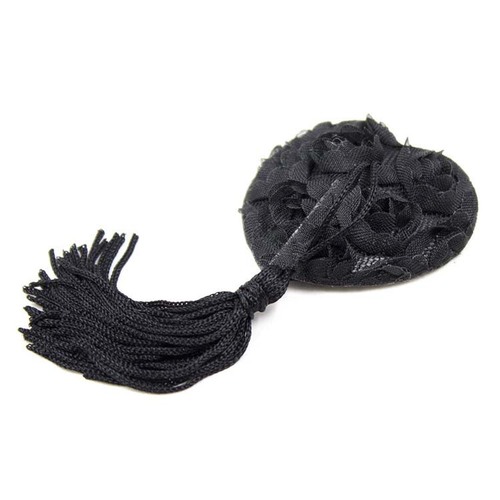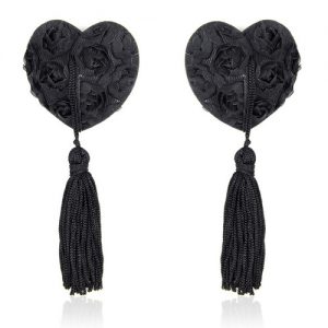 Nalepki za prekrivanje bradavičk v obliki srčka, z mini vrtnicami po površini. Z visečim cofkom iz resastih trakov. Samolepilni, 1 par v setu.
