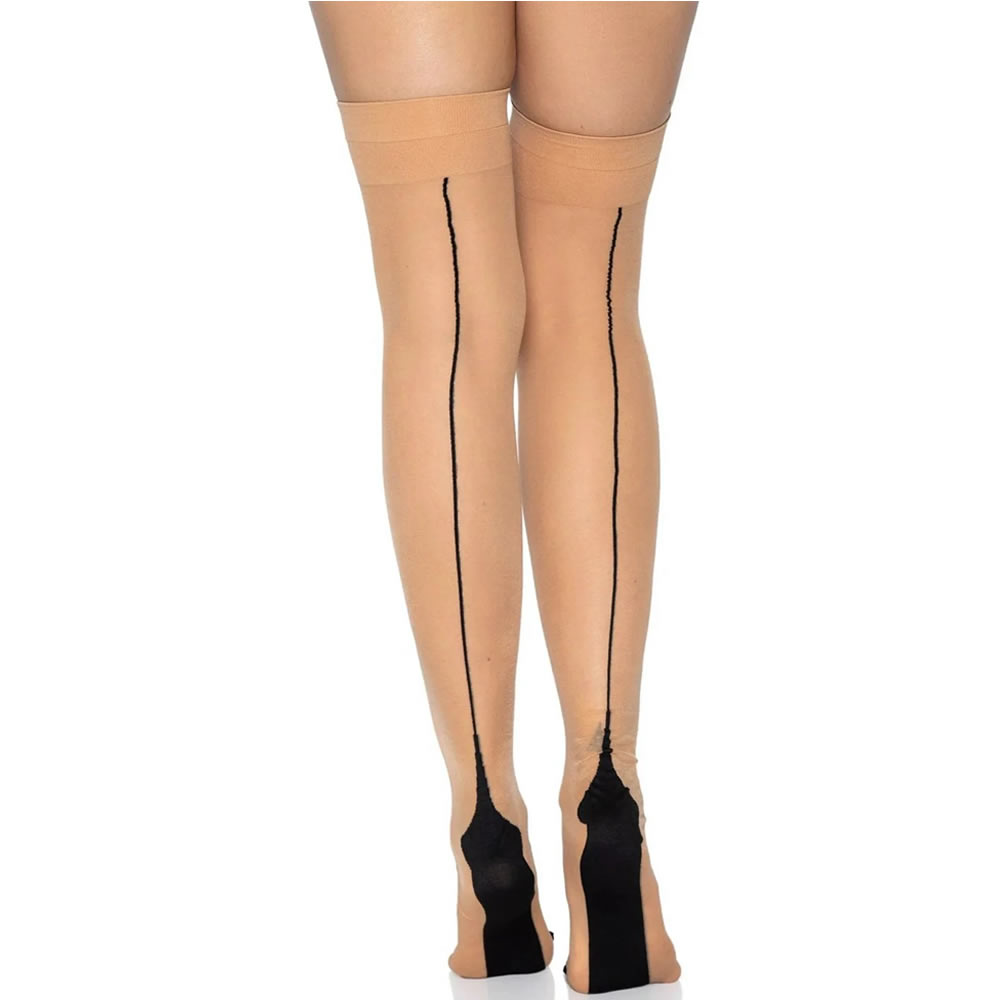Prosojne nogavice v kožni barvi, s črto na hrbtni strani, ojačanim delom v prstih in na peti. Nogavice potrebujejo pas za pripenjanje, ki jih zadrži na mestu.