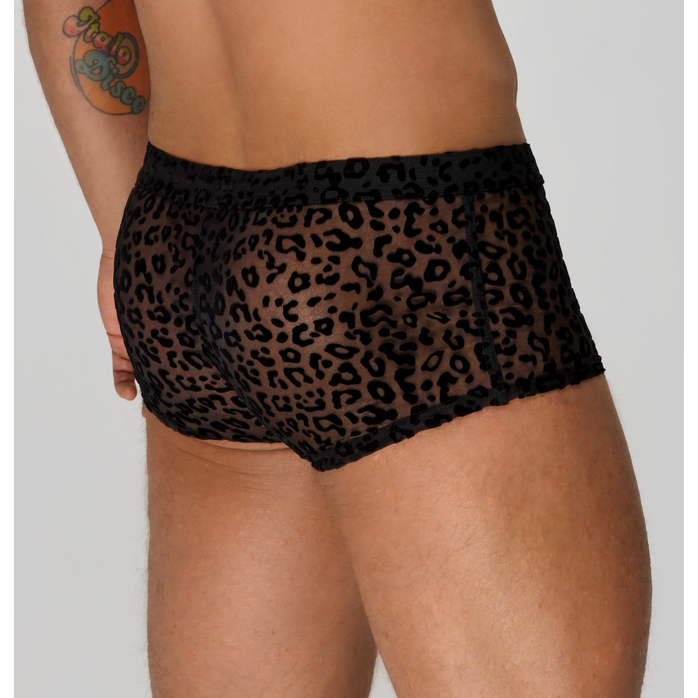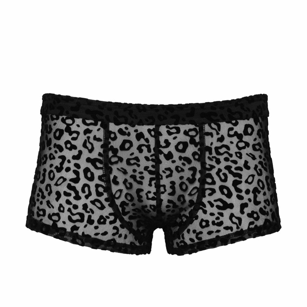 Moške bokserke z vzorcem leoparda! Ko si zaželiš stopiti na divjo stran in pokazati nekaj kože in ne želiš nobenih gumbov in zadrg, ki bi te pri tem ovirali. Prosojne, elastične moške bokserke z vzorcem leoparda.