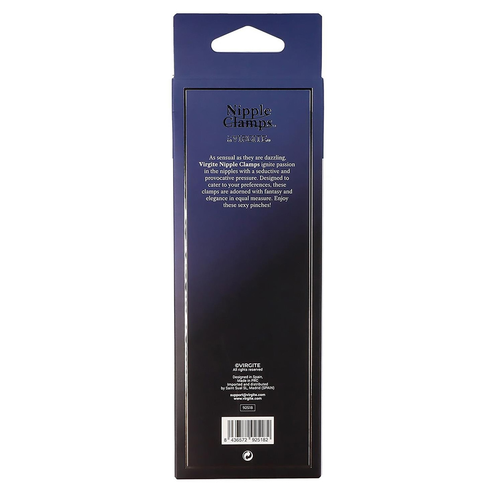 Ščipalke za bradavice Virgite so čutne in bleščeče, da v bradavicah vzbujajo strast z zapeljivim in provokativnim pritiskom. Ščipalke se zategnejo z zasukom črnega dela na ščipalkah.