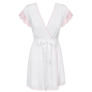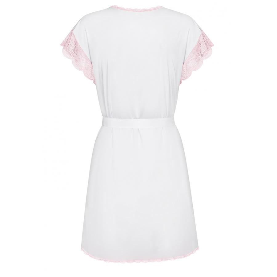 Po romantični večerji ga zapelji v tem seksi ogrinjalu! Kdo pravi, da bela ni seksi? Ogrinjalo mehko objame tvoje telo, satenast pas pa poudari silhueto v pasu. Globok, poudarjen dekolte usmeri pogled na prsi. Ogrinjalo je obrobljeno z nežno roza čipko, kratki rokavi se prav tako zaključijo s čipko.  V kompletu so tudi ujemajoče tanga hlačke.