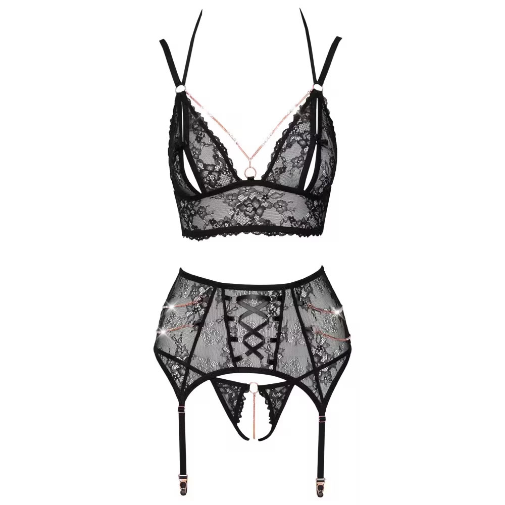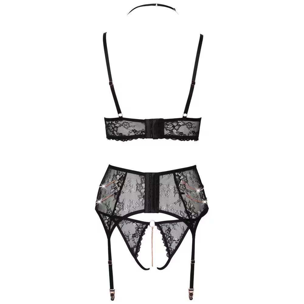Komplet znamke Abierta Fina vključuje modrček,pas in hlačke brez mednožja. Vsi kosi so izdelani iz nežne in raztegljive čipke ter okrašeni z rožnato-zlatimi elementi in verižicami z okrasnimi kamni.