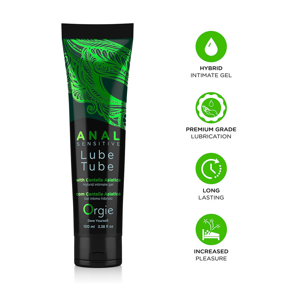 Lube Tube Anal Sensitive je hibridni intimni gel – formuli na vodni osnovi so dodane sestavine, ki simulirajo učinek silikona. Gel je posebej razvit za začetnike ali tiste, ki so bolj občutljivi na analni seks. Obogaten je s hialuronsko kislino, ki ima vlažilne in tonične lastnosti in azijsko centelo, ki pomaga pri celjenju morebitnih manjših razpok in odpravlja nelagodje po seksu.