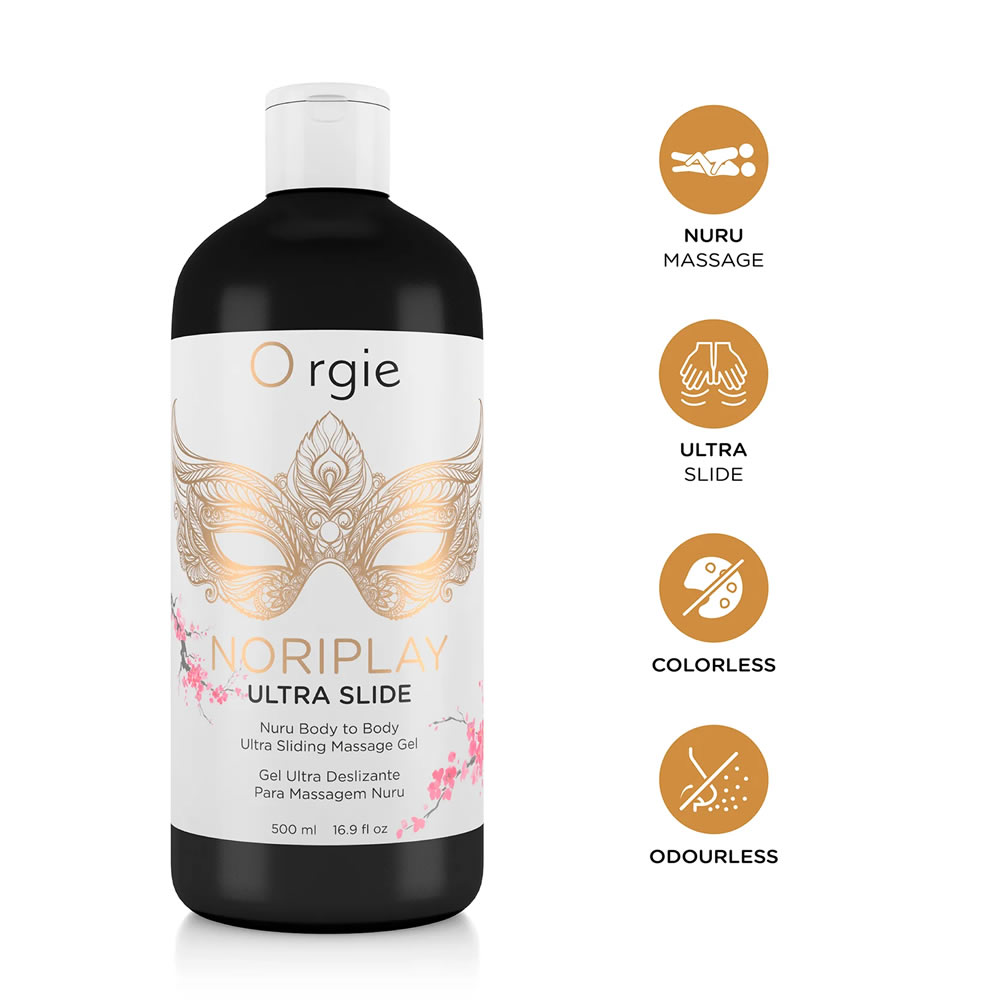 Noriplay Ultra Slide gel, formuliran z izvlečkom morskih alg. Zagotavlja popolno teksturo in super drsni učinek za izvajanje Nuru masaže telo ob telesu. Brez barve in vonja.