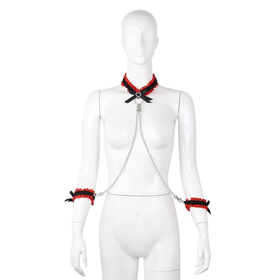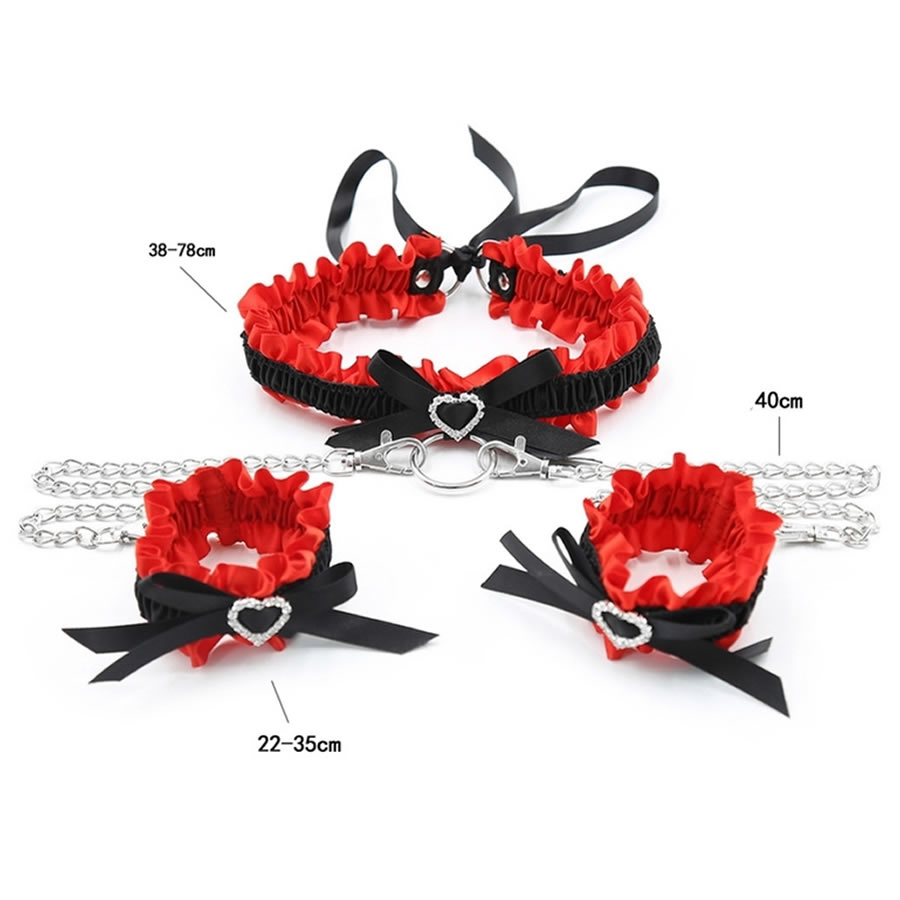 Romantična ovratnica je s kovinsko verižico povezana z lisicami za roke. Ovratnica se okrog vratu zaveže s satenastim trakom, lisice so elastične, da se prilagodijo vsem velikostim. Ovratnica in lisice so iz mehkega blaga, dekorirane s satenasto pentljo in srčkom posutim z diamantki.