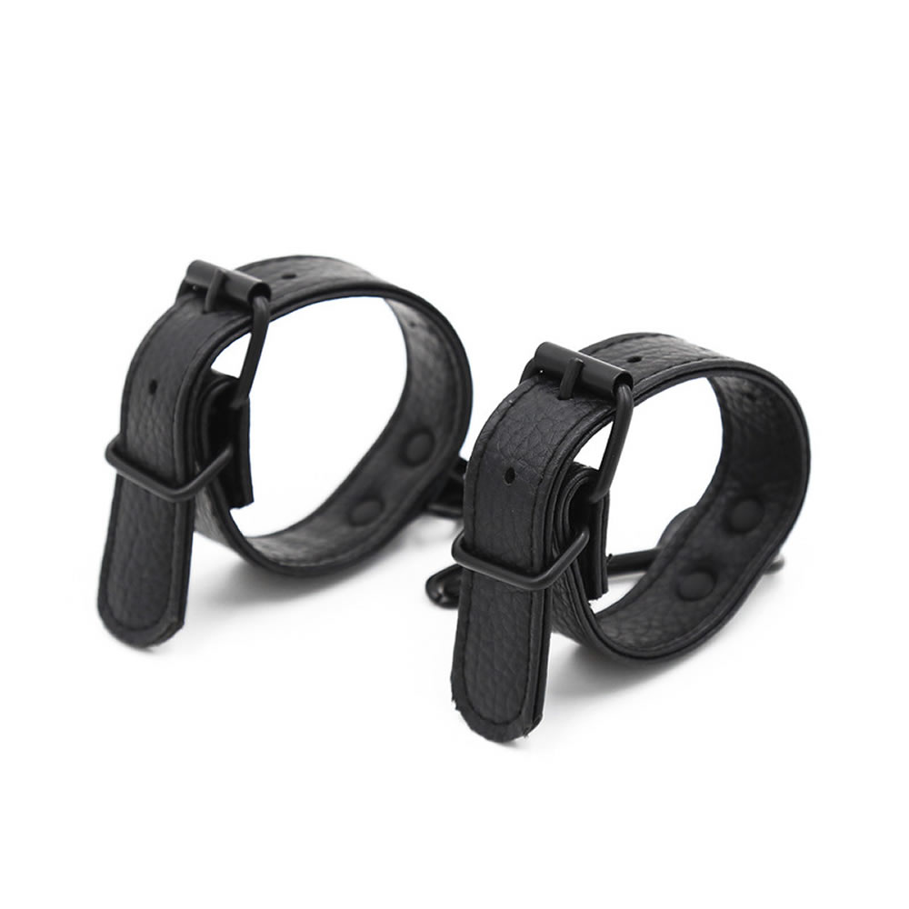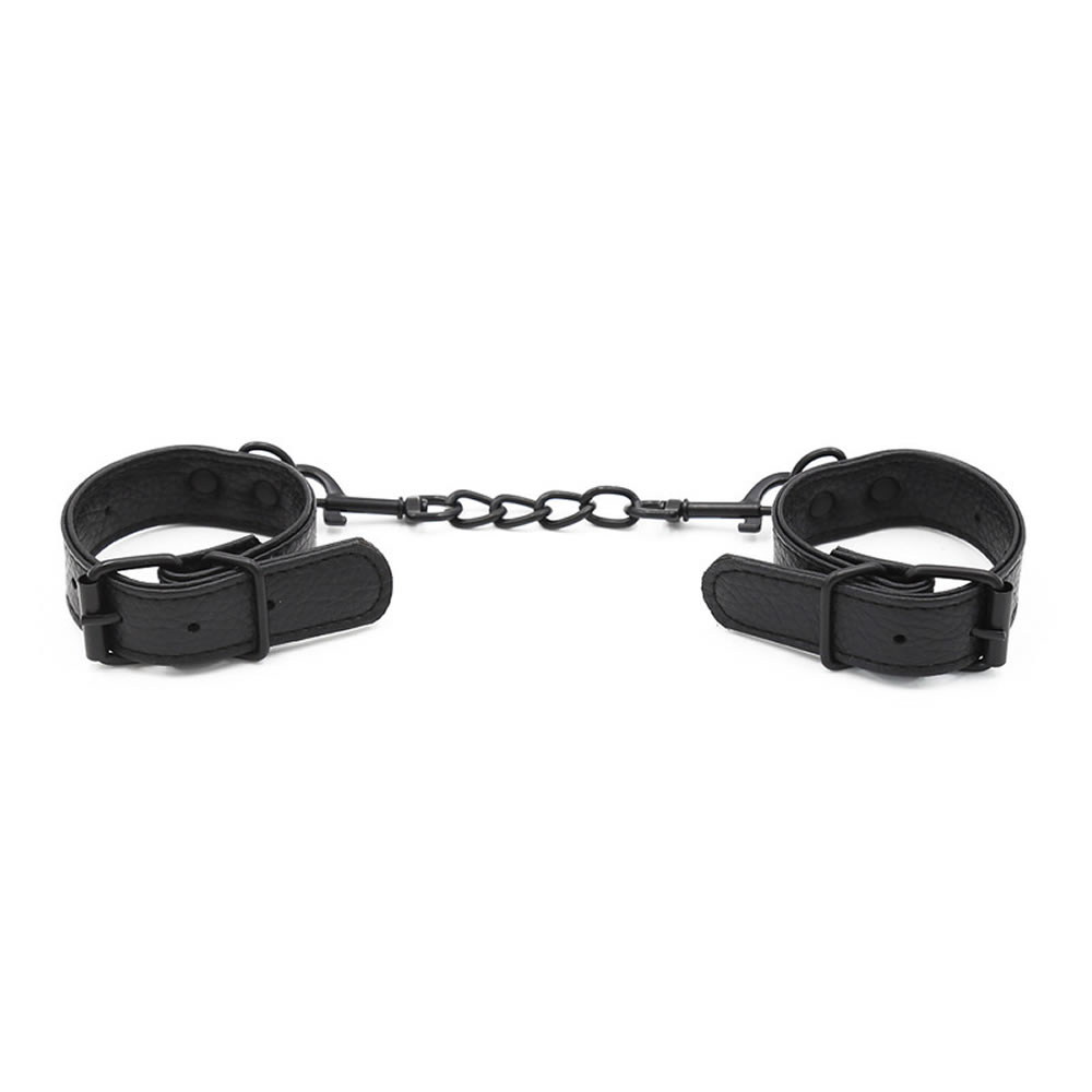 Lisice so izdelane iz umetnega usnja, s črno kovinsko zaponko za zapenjanje in črno verižico med njimi. Verižica ima 2 karabina, da lahko lisice ločiš, na njih pa je kovinski D obroček, da lahko vpneš druge izdelke za omejevanje gibanja.