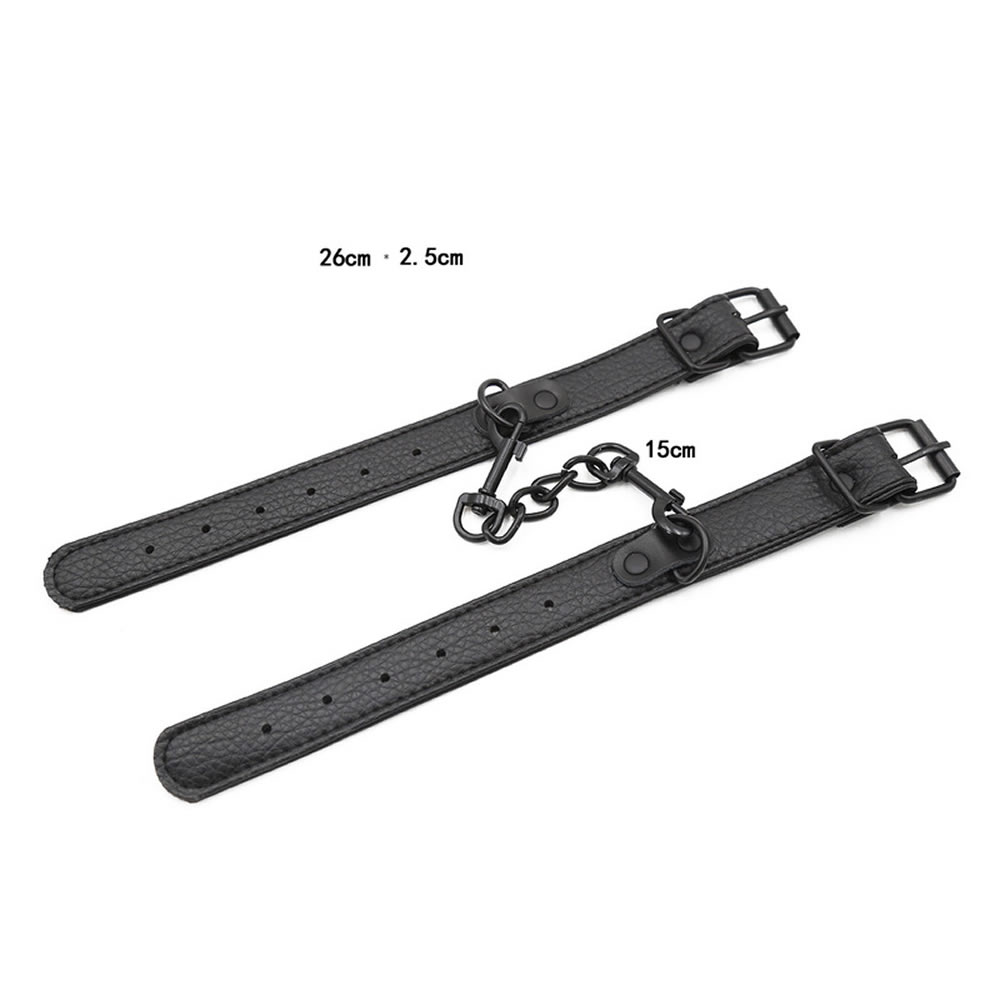 Ozke lisice iz umetnega usnja, s črno kovinsko zaponko za zapenjanje in črno verižico med njimi. Verižica ima 2 karabina, da lahko lisice ločiš.