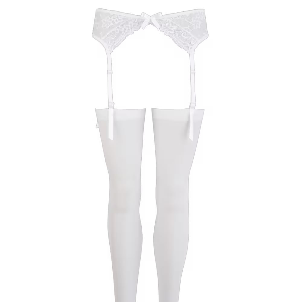 Čipkast pas za pripenjanje nogavic in ujemajoče se nogavice so igrive in seksi. Oblečejo se hitro in elegantno. Noge bodo videti naravnost osupljivo, če boste ta komplet nosili za zasebni seksi večer v dvoje ali zunaj.