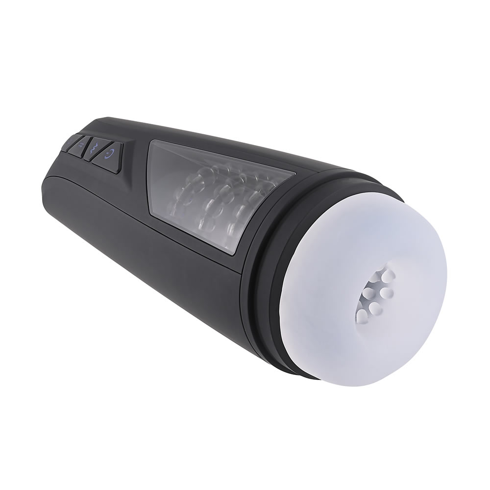 Moderen masturbator s prozornim oknom, 7 vibracijskimi ritmi in notranjimi obroči, ki se pomikajo gor in dol po penisu.