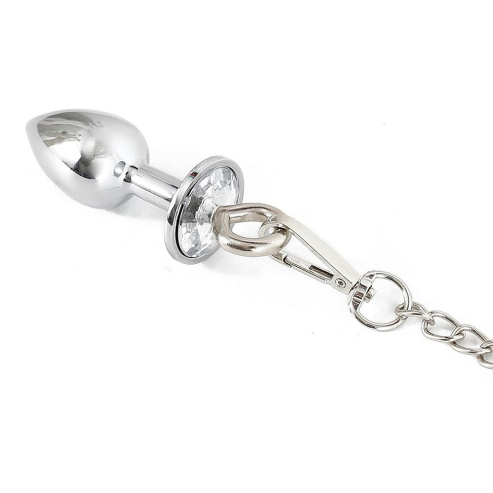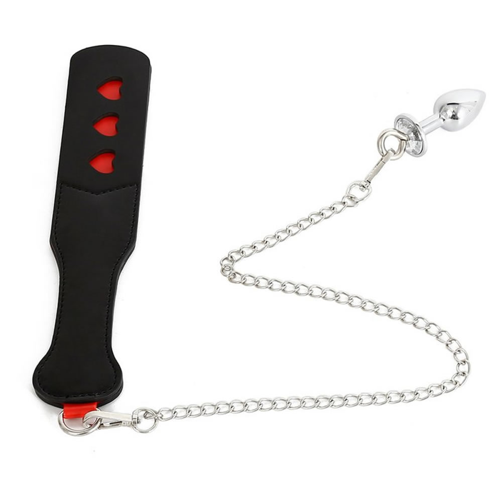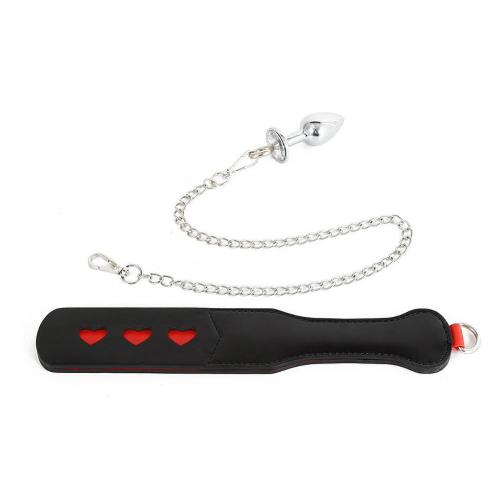 Ploščat bič za šeškanje izdelan iz dveh slojev umetnega usnja je v kompletu s kovinskim analnim čepom, ki ga preko srebrne verige povežeš na bič.