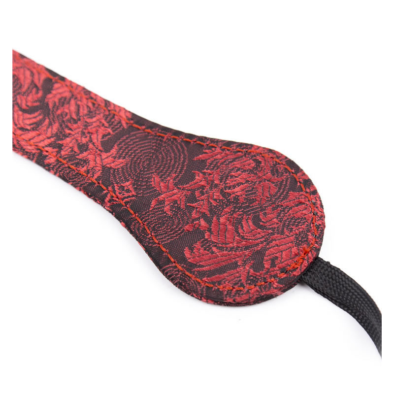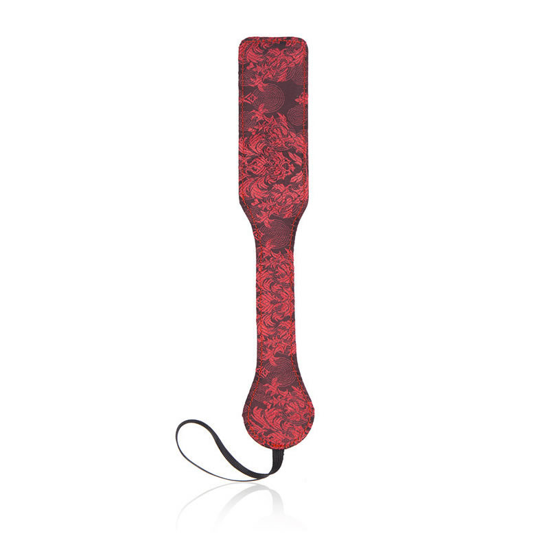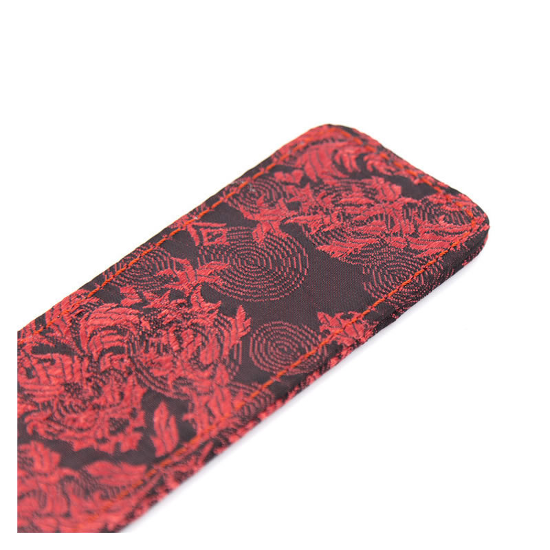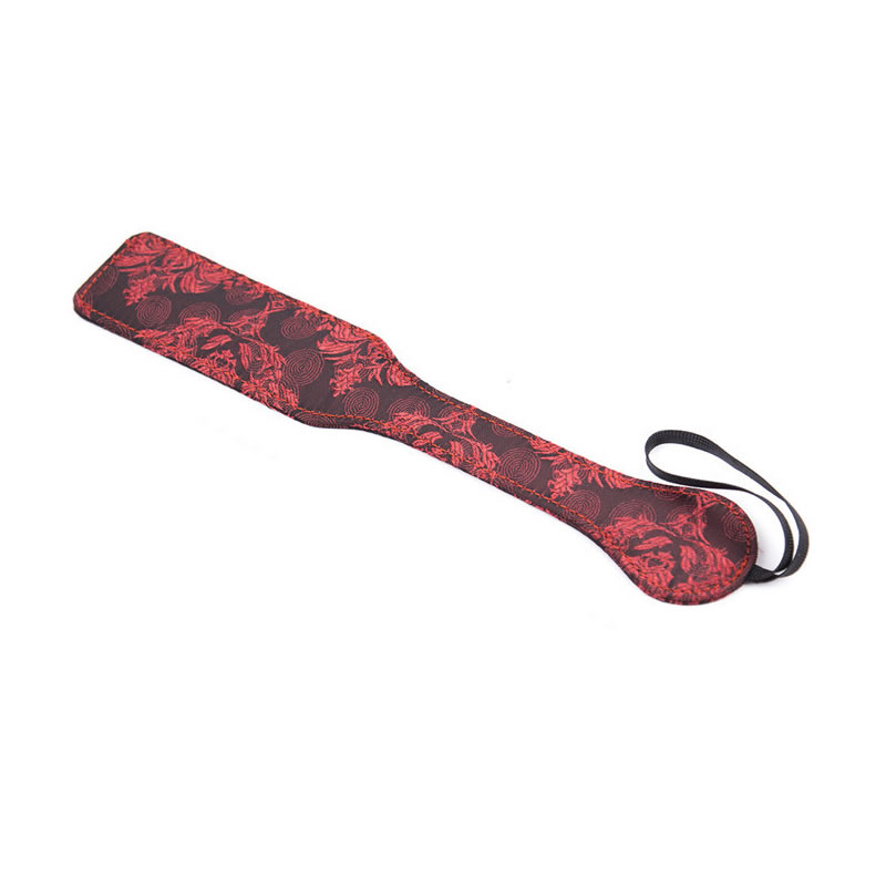 Ploščat bič za šeškanje je odet v rdeče-črn brokat z eno stranjo, ki je nežno podložena za zadovoljiv “pok” in drugo popolnoma ploščato stranjo za takrat, ko želiš, da malce zapeče. Čvrst loparček ima zanko za okrog zapestja, da sproščeno izkusiš vznemirjenje, ki ga prinese kaznovanje in nagrajevanje v spalnici.