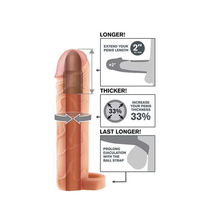 Podaljšek je izjemno raztegljiv, da se prilega večini velikosti. Je dovolj tesen, da vam pomaga trajati dlje, izjemno mehak material Fanta Flesh® pa se otipa kot druga koža. Popoln za moške z erektilno disfunkcijo in težavami s spolno zmogljivostjo.