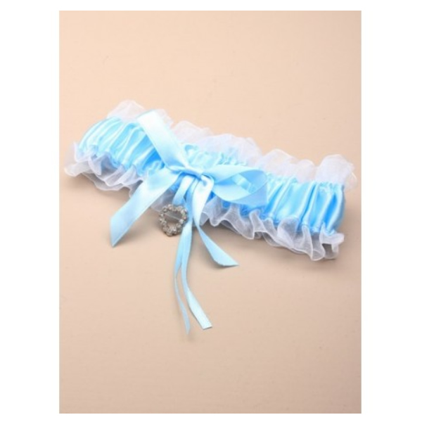 Podvezica luksuznega izgleda je izdelana iz  romantične organze čez katero se vije nežen satenast trak v modri barvi, bogat izgled pa poudari satenasta pentlja in viseč srebrn srček s kristalčki.