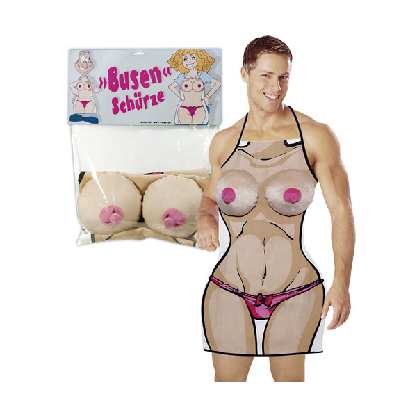 Seksi predpasnik za popestritev rojstnega dne, zabave, dekliščine, fantovščine… Predpasnik je kožne barve, ima poslikavo golega telesa in velike plišaste prsi.
