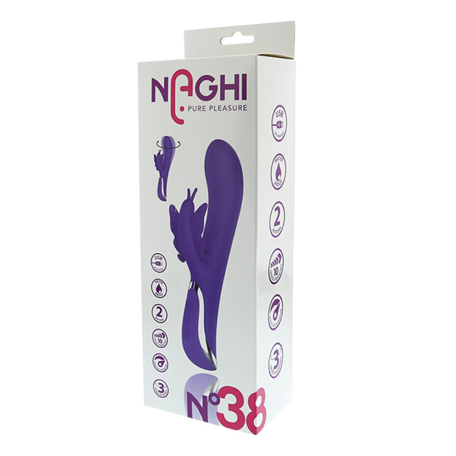 Naghi No38 je duo vibrator z dvema močnima motorčkoma. Eden izmed motorčkov je v čvrstem trupu z zaobljeno konico, drugi je v metuljčku za stimulacijo klitorisa. Poleg običajnega vibriranja, konica tega vibratorja ustvarja tudi rotirajoče gibanje v 3 hitrostih. Vibracijski motorček vibrira v 3 stopnjah in 7 različnih ritmih. Vibrator ima dodan tretji – “boost” gumb, ki omogoča, da z enim pritikom gumba vibrator takoj preklopimo na najvišjo jakost.