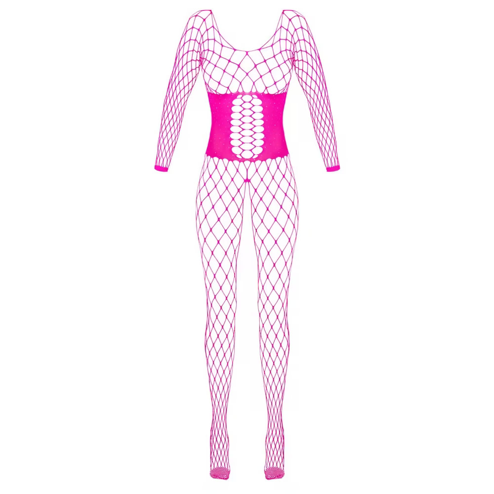 Elastičen bodisuit iz velike mreže, z razporkom v mednožju in dolgimi rokavi. Z integriranim pasom.