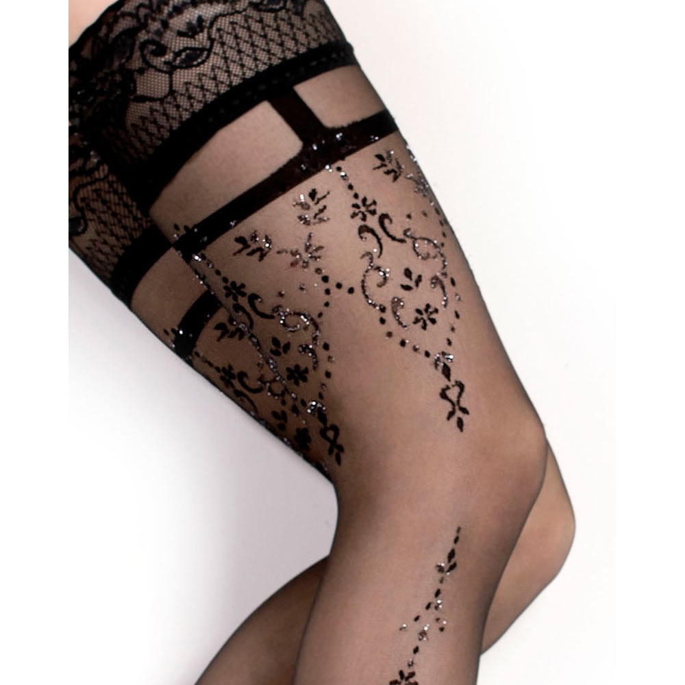 Črna barva nogavic ustvari eleganten in brezčasen videz. Črno, svetlikajoče vezenje na stegnih in mečih služi kot dekorativen element, ki poudari noge. Uporabljena kombinacija materialov doda izjemno estetsko vrednost in ustvari udobje in užitek ob nošenju.