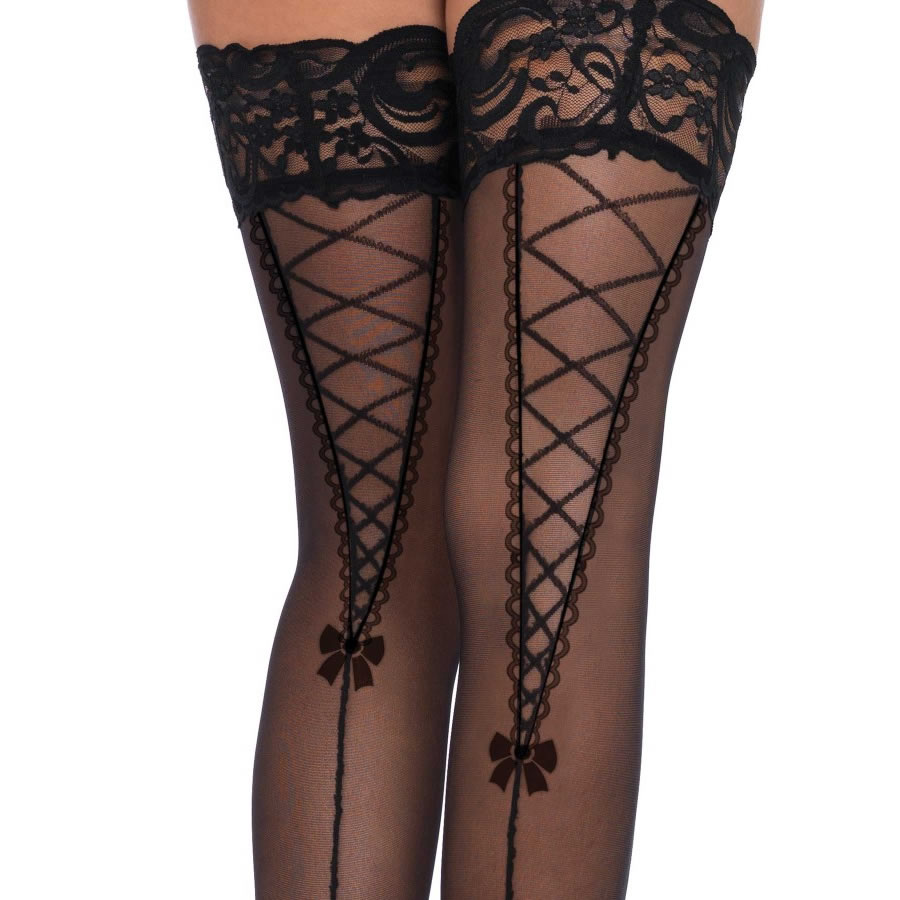 Prosojne nogavice s seksi črto na hrbtni strani noge, ki se konča s pentljo in nadaljuje v vzorec vezalke.
