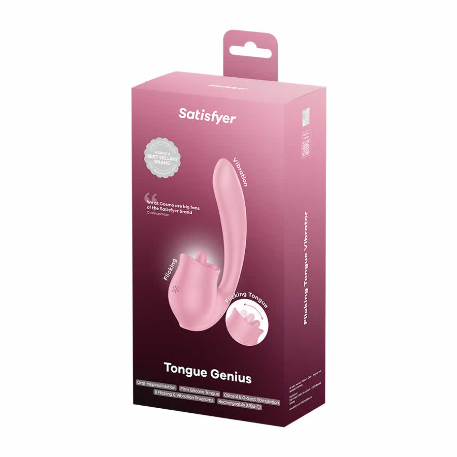 Zunaj ali znotraj – ta erotični izdelek ve, kako se stvarem streže. Z 8 načini lizanja in 8 vibracijskimi programi Tongue Genius hkrati razvaja klitoris in točko G – za orgazme, ki bodo trajali še dolgo. Čvrst silikonski jezik posnema realistične gibe jezika, ergonomsko ukrivljen ud pa natančno zadene tvojo točko G.