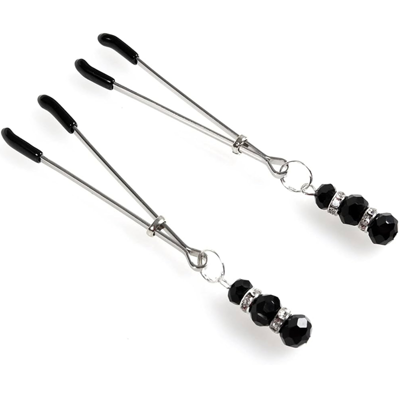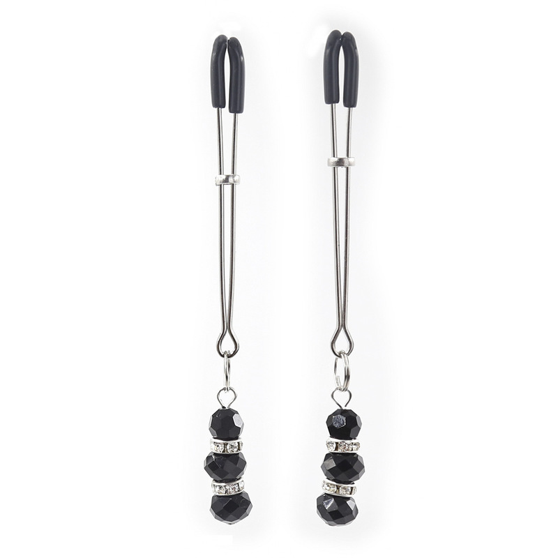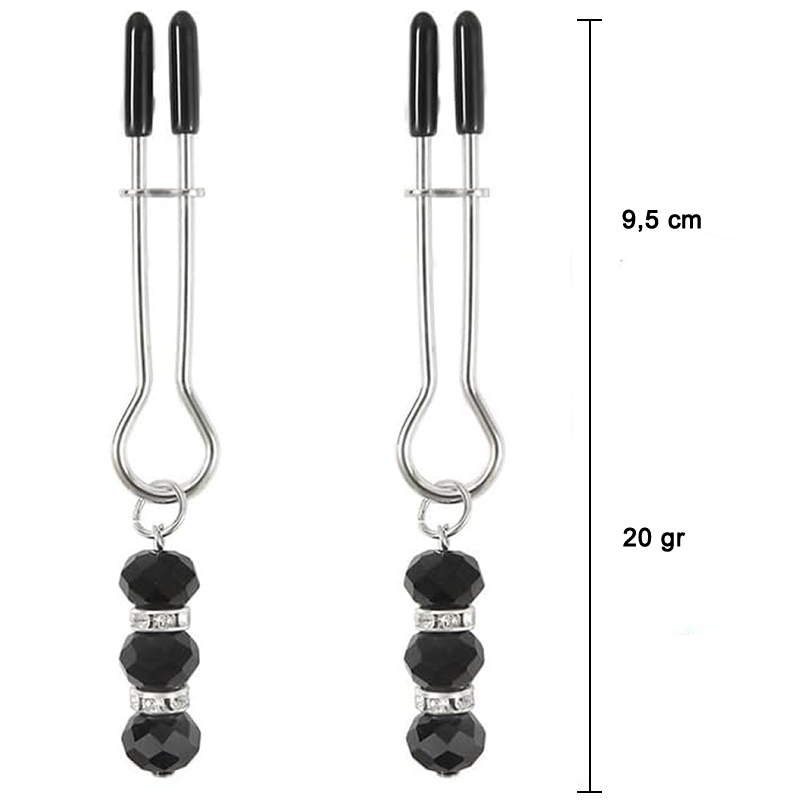 Kovinski ščipalki za bradavice imajo konico odeto v mehko gumo, da ne poškodujeta kože. Jakost stiska se regulira z obročkom na trupu ščipalke tako, da se obroček zadrsa prosti konici. Ščipalka imata eleganten obesek s svetlikajočimi diamantki.