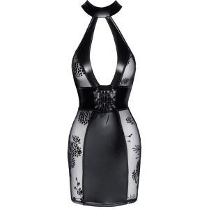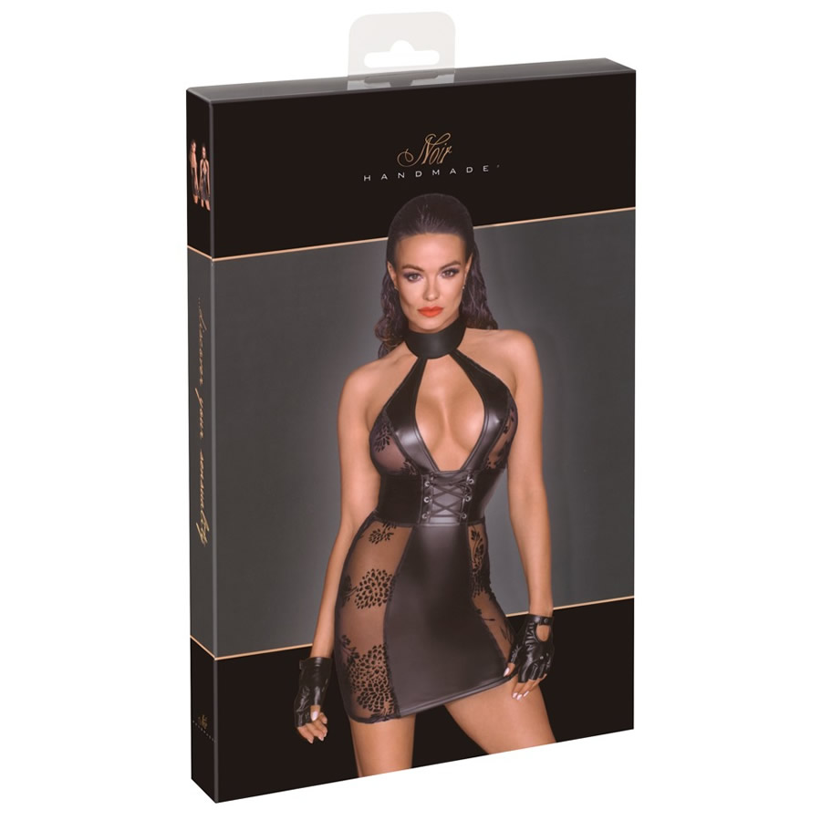 Kratka, tesno prilegajoča se obleka z ovratnico. Obleka ima velik, poudarjen dekolte in pas pod prsmi poudarjen s trakom za zavezovanje v stilu korzeta. Zgornji del hrbtnega dela obleke je odprt. Obleka ima na hrbtni strani všito zadrgo, da je oblačenje in slačenje bolj udobno. Obleka je izdelana iz na izgled mat materiala, ob straneh je prosojen material, potiskan z žametnim potiskom.