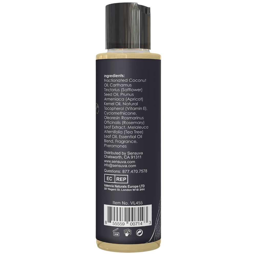 Sestavine/Ingredients: Fractionated Coconut Oil, Carthamus Tinctorius (Safflower) Seed Oil, Prunus Armeniaca (Apricot) Kernel Oil, Natural Tocopherol (Vitamin E), Cyclomethicone, Oleoresin Rosmarinus Officinalis (Rosemary) Leaf Extract, Melaleuca Alternifolia (Tea Tree) Leaf Oil, Essential Oil Blend, Fragrance, Pheromones