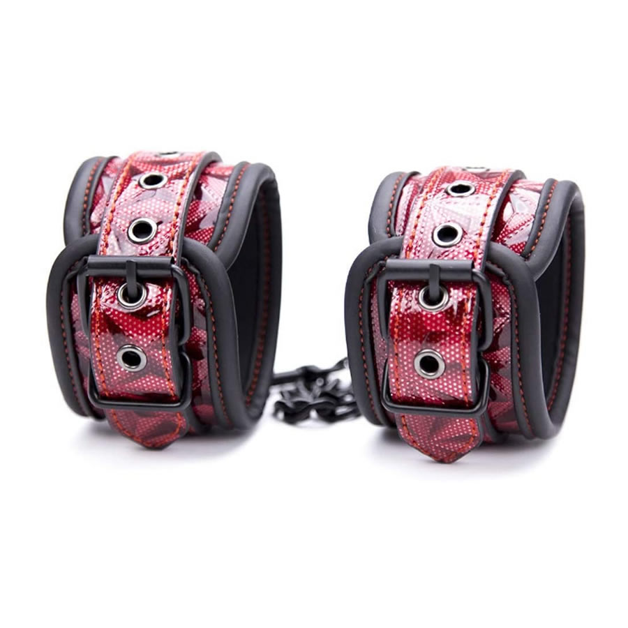 Komplet bdsm igračk iz kombinacije sijočega lakastega umetnega usnja in mehke pene. Njegov izgled daje pridih luksuza.