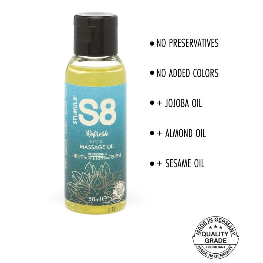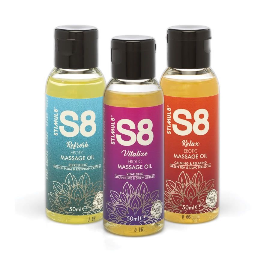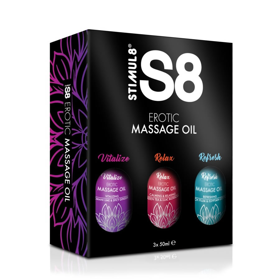 Bogata masažna olja S8 so edinstvena mešanica 3 močnih olj: jojobe, ki neguje in ojača kožo, mandlja za vlaženje in nego in sezama, ki je visoko hranljivo in vlažilno. To olje je obogateno z esencialnimi vitamini in minerali. Po dobri masaži bo tvoja koža svileno gladka in sproščena. Ta darilni set vsebuje 3 različne dišave: omanska limeta s pekočim ingverjem, zeleni čaj & cvet lilije in francoska sliva z egiptovskim bombažem.