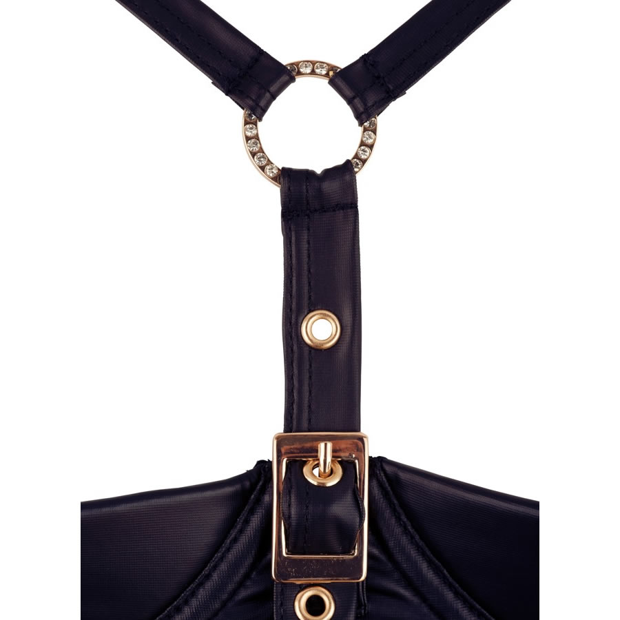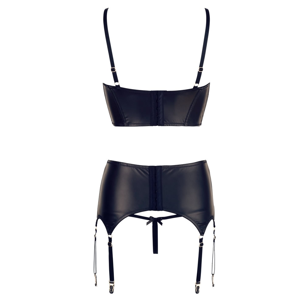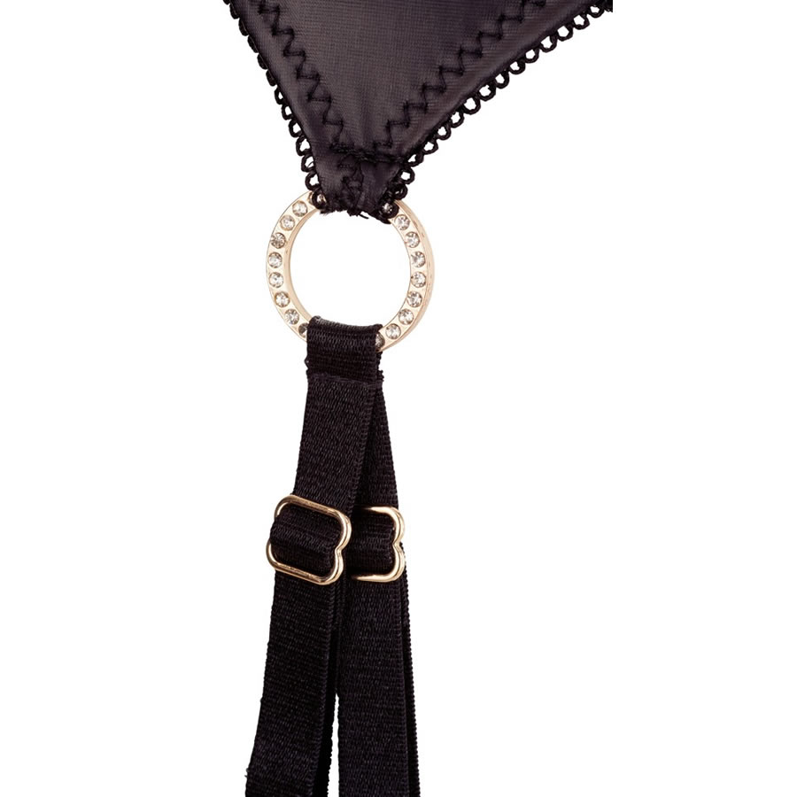Črn modrček z žičnato oporo in kaveljčki za zapenjanje na hrbtni strani čudovito poudari ženske atribute. Nad nežno podloženima košaricama sta trakova, ki čudovito objameta prsi. Sredino dekolteja krasi kovinski obroček z luksuznimi diamantki. Ujemajoč pas za pripenjanje nogavic se prav tako zapenja s kaveljčki na hrbtni strani, majhen dekorativen obroč z diamantki na sprednji strani pa pritegne pogled. Pas ima dva paščka na sprednji strani in po enega na hrbtni strani in tako zagotovi popolno podporo. Priložene ujemajoče tanga hlačke so z razporkom in lepo dopolnijo celoten set perila. Nogavice niso del kompleta.