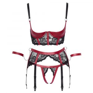 Čudovit set perila je sestavljen iz topa z odprtima košaricama, pasa za pripenjanje nogavic, tanga hlačk in mehkih lisic. Top ima oblikovani podloženi košarici, da nudita oporo prsim. Naramnici sta elastični, s prilagodljivo dolžino. Top se na hrbtni strani zapenja s kaveljčki. Pas za nogavice ima na bokih kovinski obroček, kamor se vpnejo mehke lisice. Dolžina paščkov za pripenjanje nogavic je prilagodljiva.