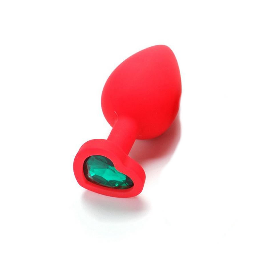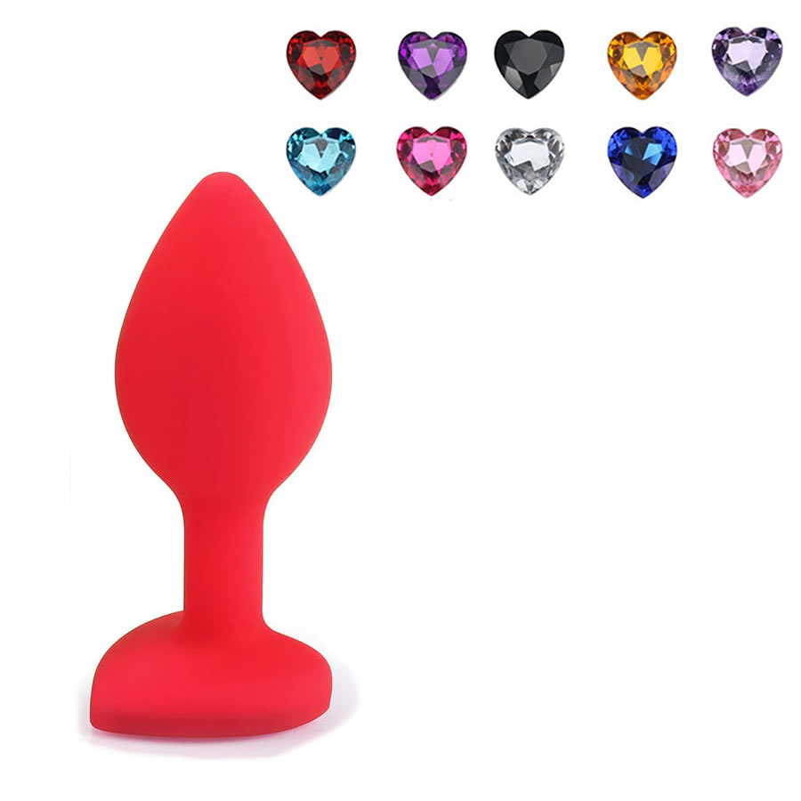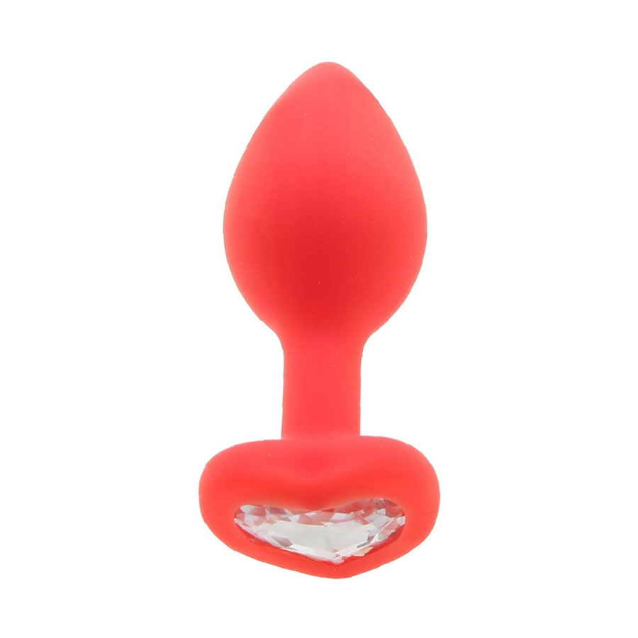 Rdeč silikonski analni čep z diamantom v obliki srca v razširjeni bazi.