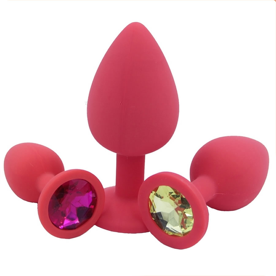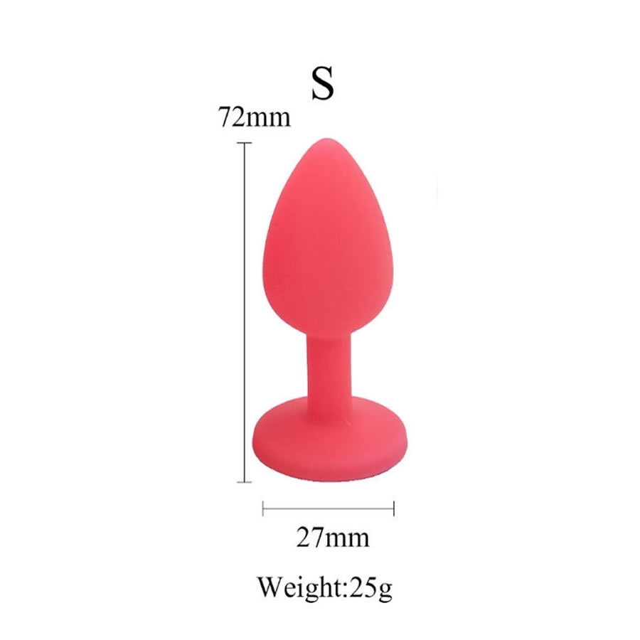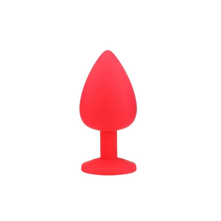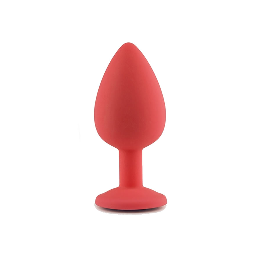 Iz svileno gladkega silikona izdelan analni čep, z razširjeno bazo za varno uporabo in okrasnim diamantom v njegovi bazi.
