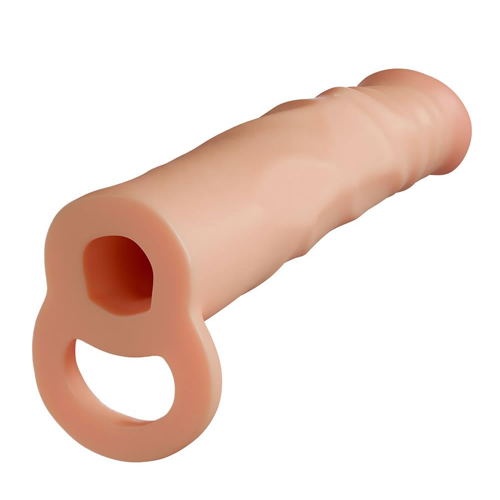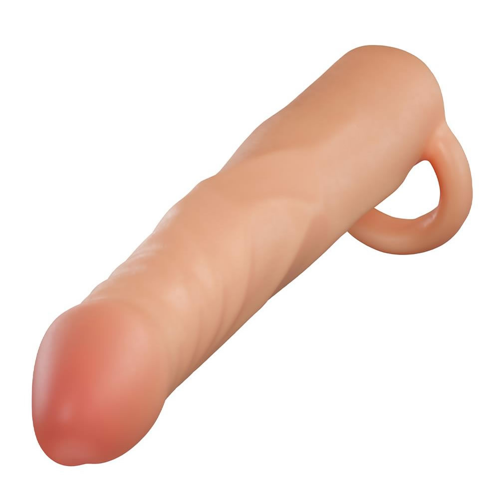 Realistično oblikovan silikonski podaljšek iz dvoslojnega silikona ti doda 6,3 cm v dolžino, in 3,8 cm v obsegu. Izdelan s pasom za moda, da stoji na mestu.
