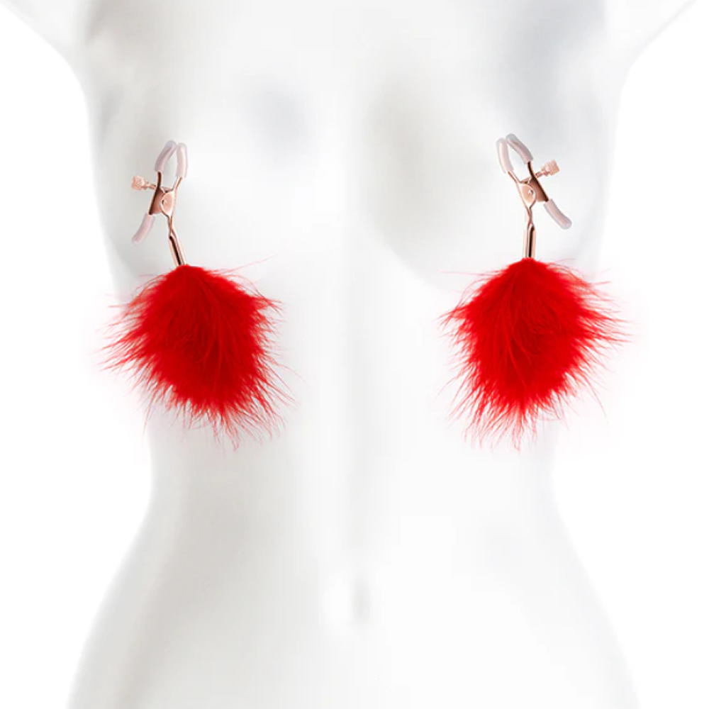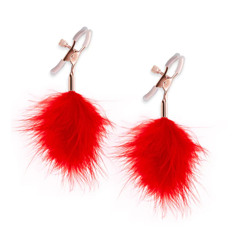 Par ščipalk za bradavice, s prilagodljivim stiskom, z obeskom iz rdeče obarvanega perja.