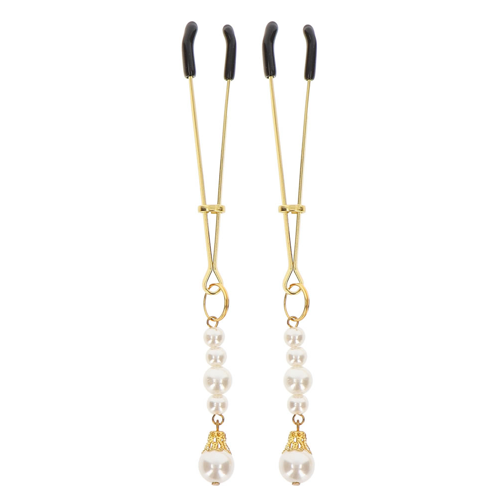 2 zlato obarvani sponki za bradavice okrašeni s perlami. Z obročkom za možnost prilagoditve stiska.