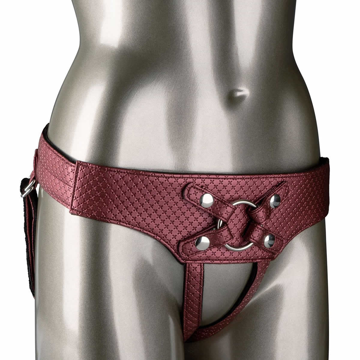 Strap-on pas izdelan iz veganskega usnja in priloženimi tremi kovinskimi obroči za vpenjanje dilda.
