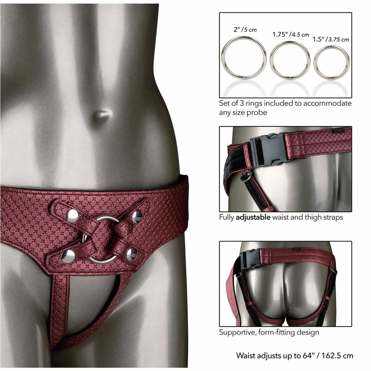 Pripravi se za vznemirljiv užitek in zabavo! Njen kraljevski strap-on-pas pas je izdelan iz veganskega usnja in plišastega, žametnega notranjega dela za popoln nadzor in udobje. “Snap-in ring” sistem omogoča vpenjanje treh različnih velikosti obročkov, da se lahko vpne katerakoli velikost dilda ali analnega čepa. Dizajn s povsem odprtim razkorakom ti dovoli, da se podrediš svojim najbolj erotičnim fantazijam in užitkom.