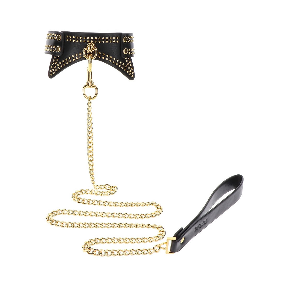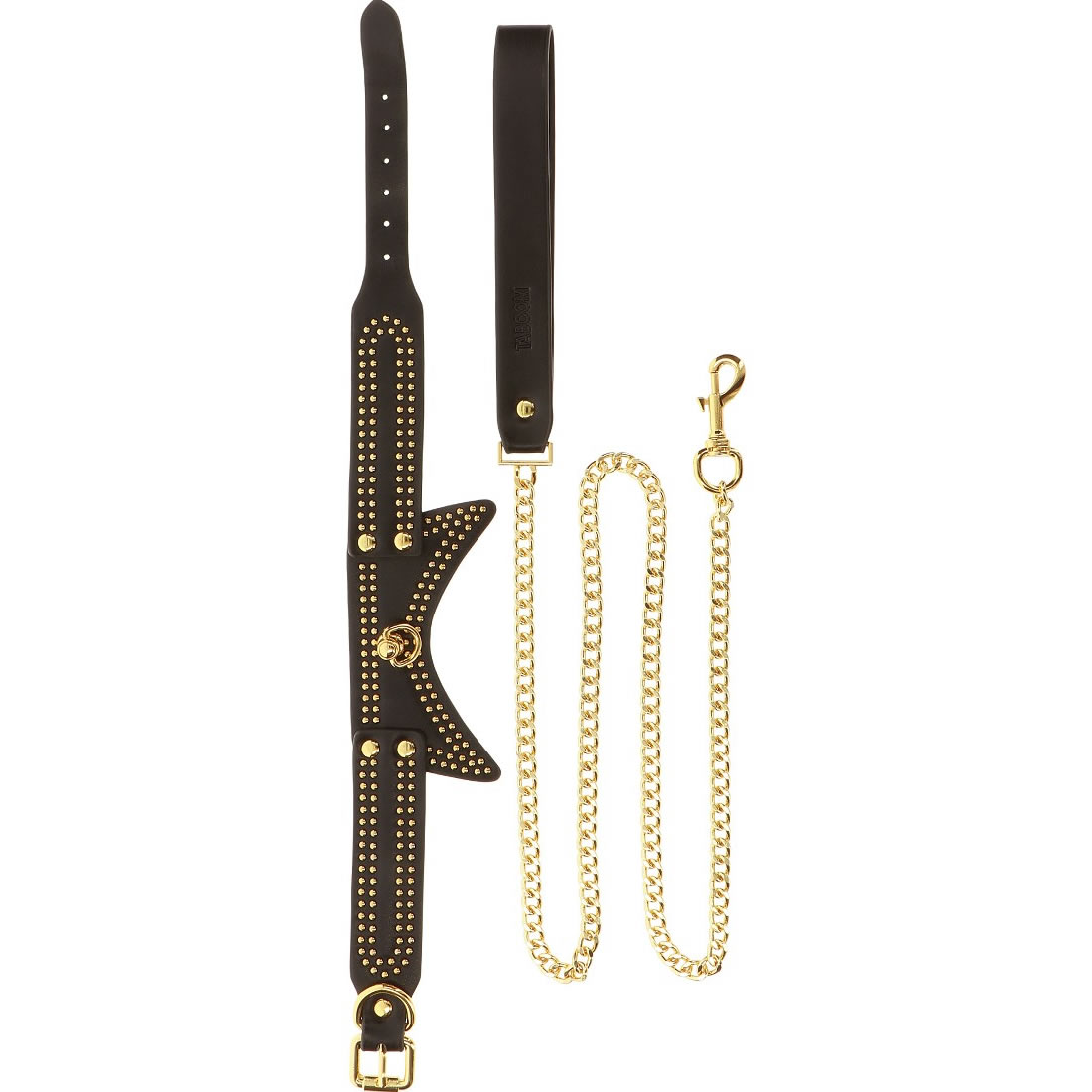 TABOOM ovratnica in povodec sta zasnovana za tiste, ki želijo raziskovati vezanje in BDSM z neprimerljivim slogom. Ta očarljiv komplet ima eleganten črn ovratnik okrašen z razkošnimi zlatimi detajli, ki oddajajo avro čutnosti, prefinjenosti in privlačnosti.
