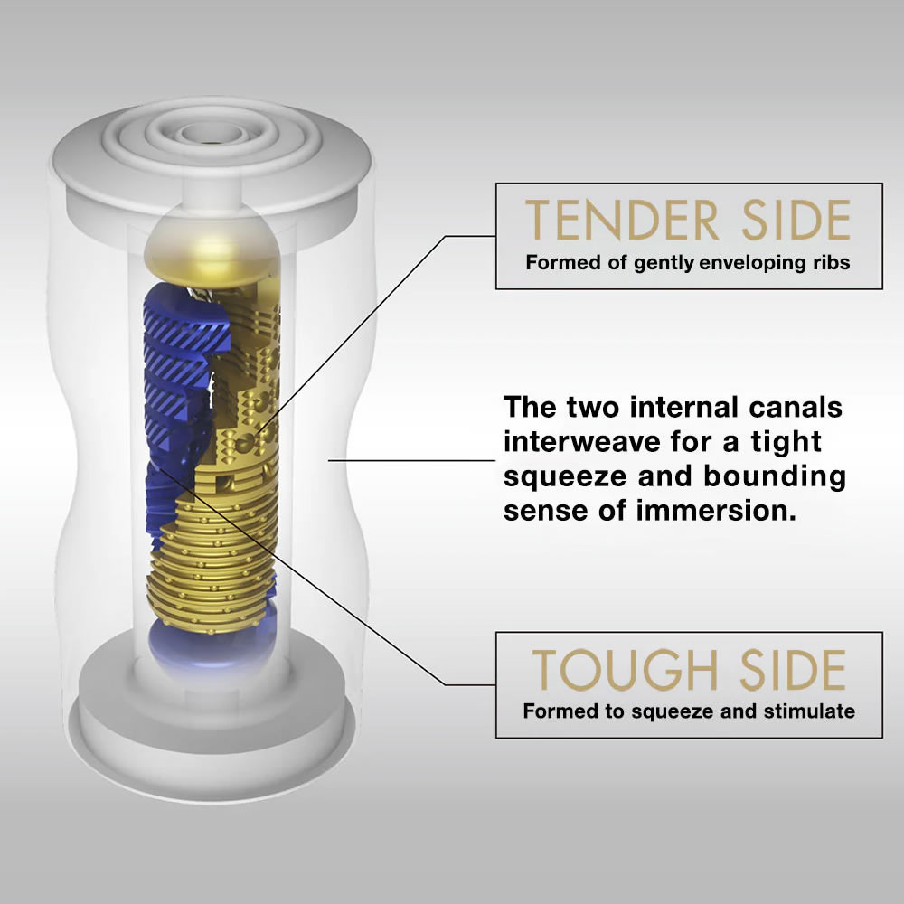 Masturbator Dual Sensation Cup znamke TENGA je diskretnega dizajna. Ta različica Premium ima še bolj dodelano teksturo v notranjosti, še več visokokakovostnega silikona, še bolj prožno stiskalno čašo in še boljši lubrikant za še bolj gladko mazanje. Masturbator za enkratno uporabo je odprt na obeh koncih (ena stran je za nežno stimulacijo, druga pa za intenzivno stimulacijo) in se lahko uporabi takoj. Po mehkem vstopu je penis nato prekrit z veliko lubrikanta Premium, kar pomeni, da dodatni lubrikant ni potreben. Dve različni teksturi v notranjosti z različnimi premeri nežno ali intenzivno masirata penis.