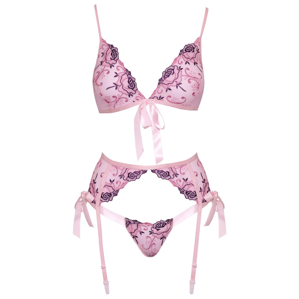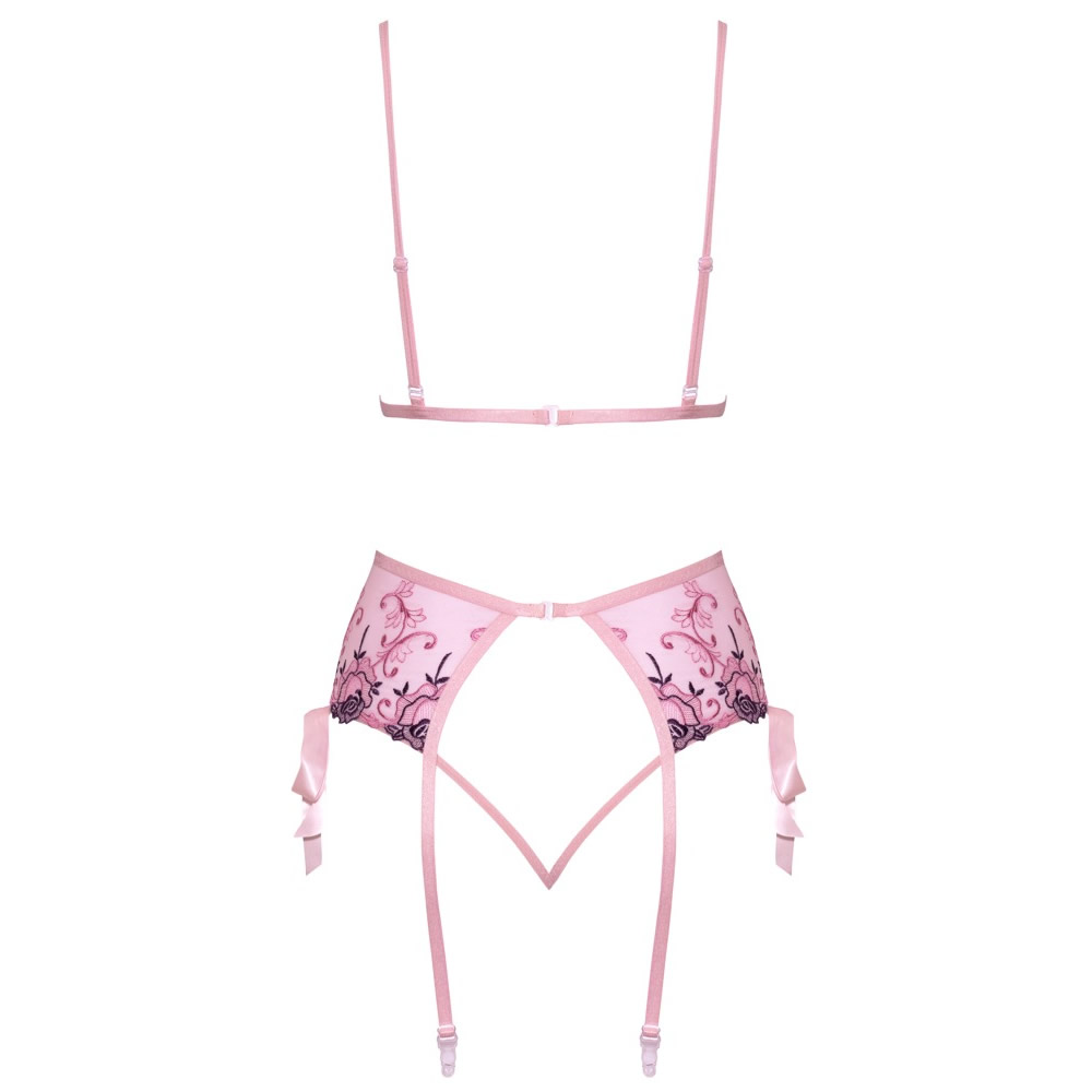 Komplet je izdelan iz prosojne mrežice z elegantnim vezenjem v črnibarvi. Je mehak in elastičen, zaradi česar je udoben za nošenje. Na sprednji strani modrčka je igriva satenasta pentlja, enako tudi na vsaki strani hlačk. Majhne, zapeljive hlačke imajo na hrbtni strani dva ozka elastična traka, ki se združita v razkoraku.