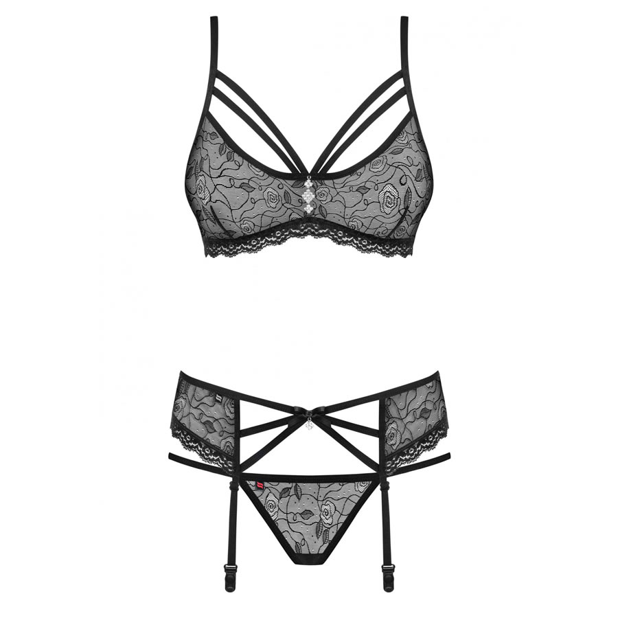 Komplet je sestavljen iz modrčka, pasu za pripenjanje nogavic in tanga hlačk. Modrček je mehak, z čudovitim dekorativnim obeskom na sredini med prsmi. Nad prsmi sta 2 paščka, ki se združita z naramnicama, da poudarita dekolte. Modrček se zapenja s kaveljčki na hrbtni strani. Pas za pripenjanje nogavic je okrašen z dekorativnim obeskom, sredinski del pod popkom ima dodano okrasno satenasto pentljo. Priložene tanga hlačke so v ujemajočem slogu.